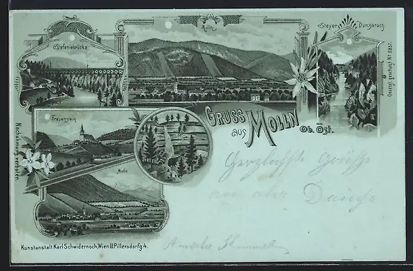 Mondschein-Lithographie Molln /Ob. Öst., Steyer-Durchbruch, Stefaniebrücke, Frauenstein, Ortsansicht