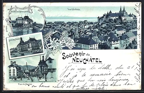 Mondschein-Lithographie Neuchatel, Hotel des Postes, Place du Marché, Vue Generale