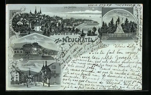 Mondschein-Lithographie Neuchatel, Vue Generale, Musée des Beaux Arts, Place du Marché