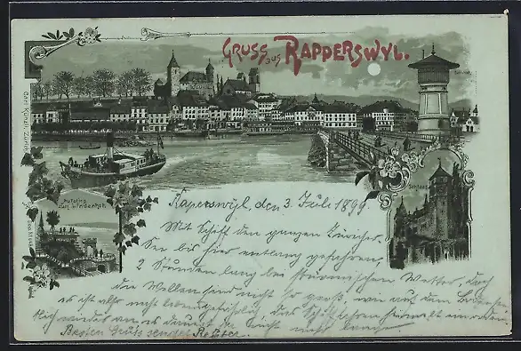 Mondschein-Lithographie Rapperswyl, Panorama mit Wasserturm und Dampfer, Schloss, Aufstieg zum Lindenhof