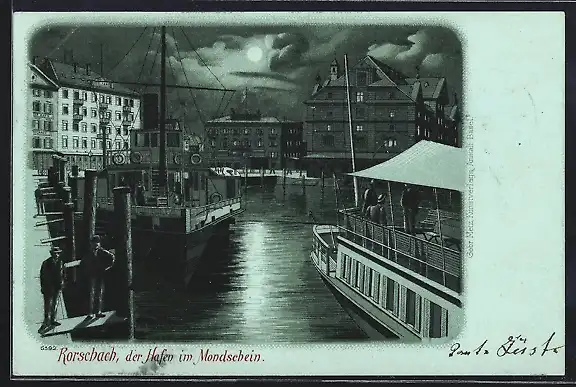 Mondschein-Lithographie Rorschach, Dampfer im Hafen