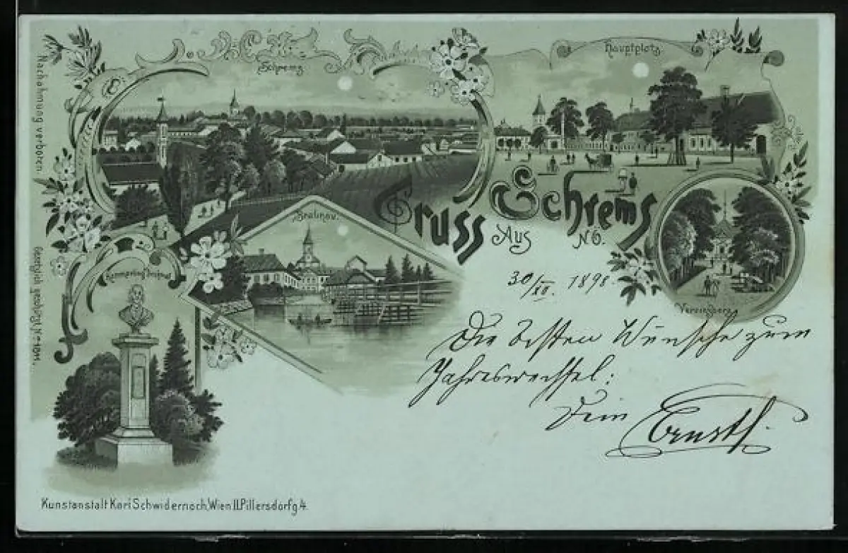 Mondschein-Lithographie Schrems /N.-Ö., Hauptplatz, Vereinsberg, Hammerling Denkmal, Ortsansicht aus der Vogelschau