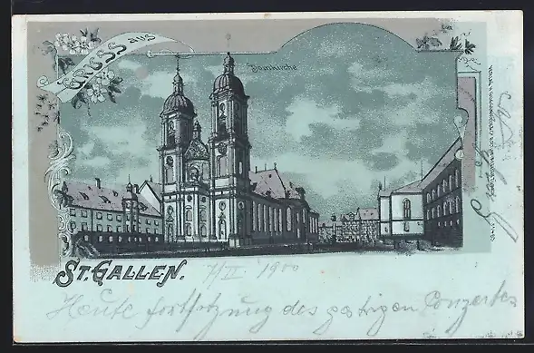 Mondschein-Lithographie St. Gallen, Ansicht der Domkirche