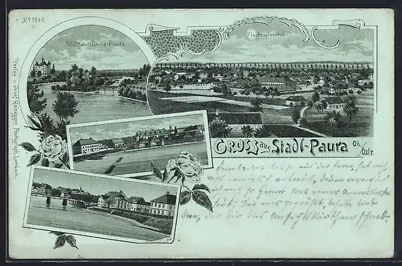 Mondschein-Lithographie Stadl-Paura /Ob. Östr., Fluss und Wallfahrtskirche, Flachsspinnerei, Ortsansichten