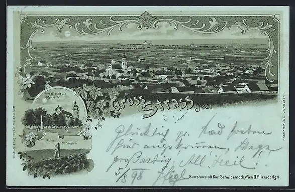 Mondschein-Lithographie Strass /N. Ö., Prangersäule, Ruine Falkenstein, Pfarrkirche