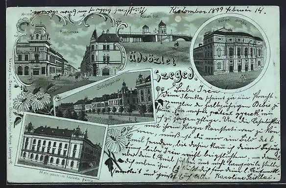 Mondschein-Lithographie Szeged, Hid-utcza, M. kir. Posta, Varosi szinhaz