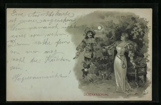 Mondschein-Lithographie Überraschung, Trompeter von Säckingen trifft Geliebte