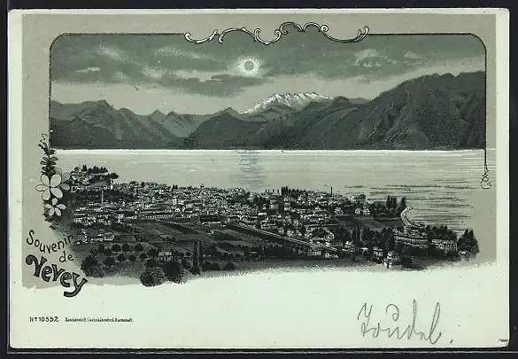 Mondschein-Lithographie Vevey, Stadtansicht vor See und Bergen