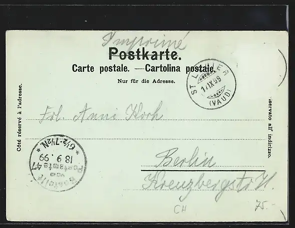 gelaufen 1899, Briefmarke entfernt, rückseitig Oberflächenschaden, Eckknick li. unten, guter Zustand