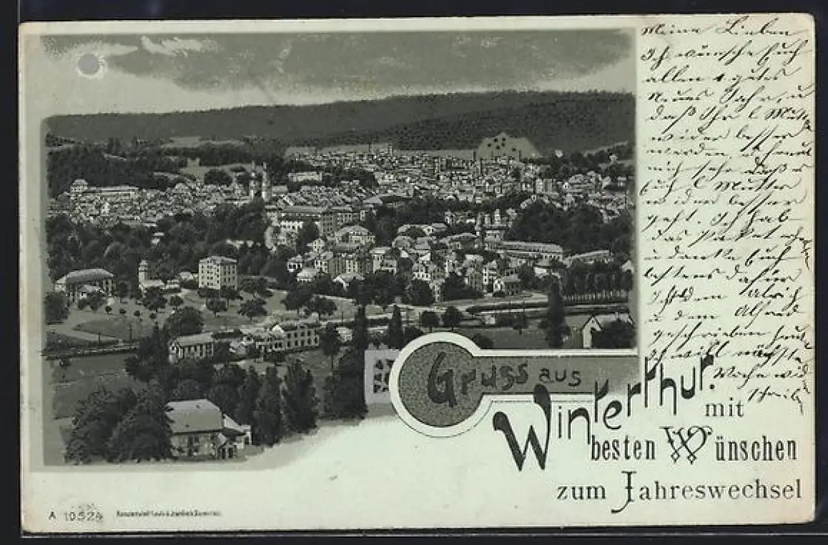 Mondschein-Lithographie Winterthur, Ortsansicht im Vollmondlicht