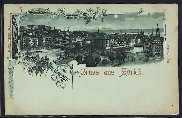 Mondschein-Lithographie Zürich, Teilansicht mit Flusspartie