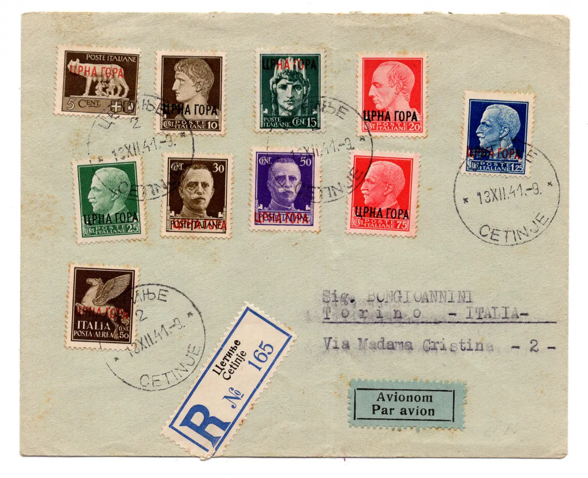 Umschlag - Montenegro Briefmarken aus Italien in kyrillischer Schrift CRNA GORA komplette Serie Nr. 15/23 + Luftpost Nr. 9 auf Umschlag Racc. von Cettigne nach Turin am 13.12.41 - Umschlag mit Falz in der Mitte ohne Annullierung der Ankunft - perfekte Briefmarken Katalog Euro240 Cod.2232/WEB