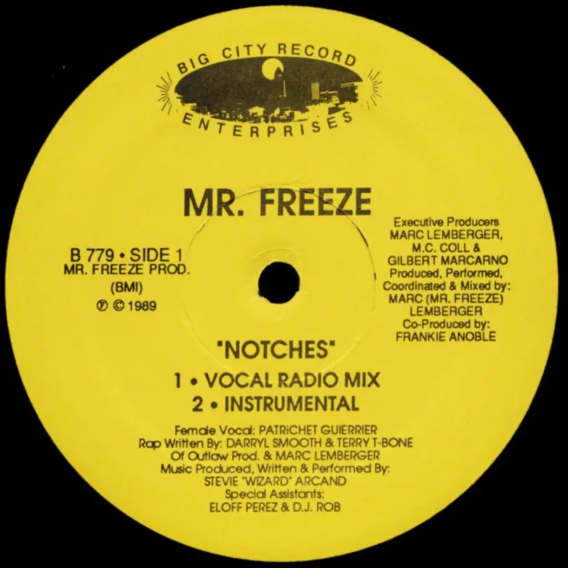 12" Maxi Mr. Freeze - Notches, neutrales Cover, Zustand Platte M-; Made in United States 1989 Big City Records B 779, Tracks Vocal Radio Mix, Instr., Radio Club Mix, Acappela, Bass Mix