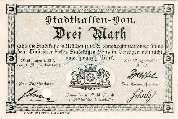 Mühlhausen , Notgeld 3 Mark Schein in unc-kfr.E Diessner 247.7 , Elsass 1914 Notgeld 1914-15