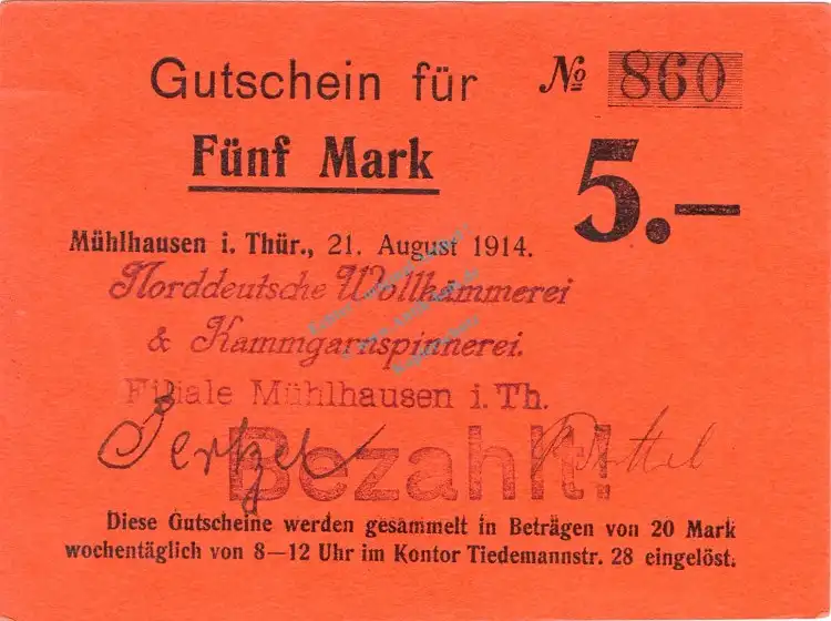 Mühlhausen , Notgeld 5 Mark Schein in unc-kfr.E Diessner 246.5 , Elsass 1914 Notgeld 1914-15Norddeutsche Wollkämmerei & Kammgarnspinnerei Filiale Mühlhausen