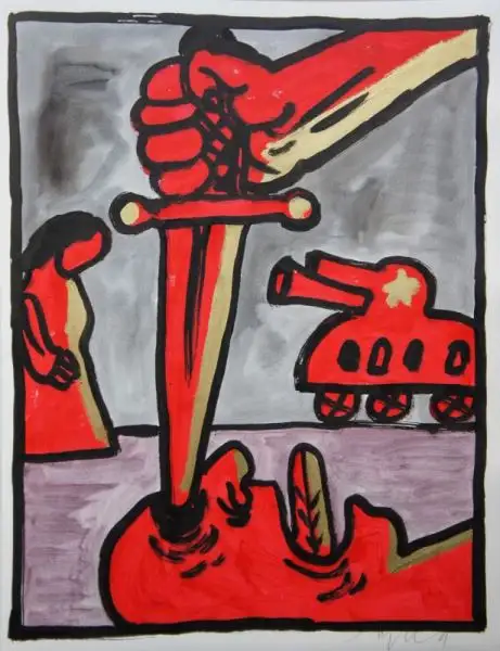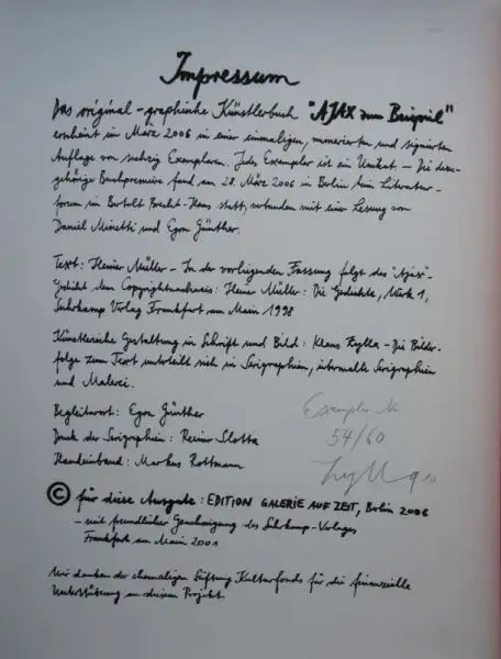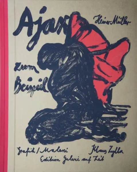 Edition Galerie auf Zeit, Berlin, 2001. Gr.-2°. Pressendruck. Originalgrafisches Künstlerbuch mit 2 ganzseitigen Siebdrucken, 4 übermalten Siebdrucken und 4 Originalen von Klaus Zylla in einer Auflage von 60 Exemplaren. Beiliegend der Text von Heiner Müller in gedruckter Form. Müllers Gedicht ''''Ajax zum Beispiel'''' ist einer der wichtigsten Texte seiner späten Schaffensphase. Anhand der Figur des Ajax beschreibt der Dichter den Niedergang der alten Epoche und die Konfrontation mit der neuen Zeit. Ajax ist dabei tragisch angelegt. Er verkörpert das Nicht-Korrumpierbare; insofern ist er auch eine Hoffnungsgestalt. Aus diesem Widerspruch heraus hat sich Klaus Zylla zu einem konzeptionellen Künstlerbuch inspirieren lassen, mit Serigrafien und freier Malerei. Jedes Buch ist ein Unikat. Der Film-Regisseur Egon Günther hat ein die Wirren dieser, unserer Zeit aufnehmendes Begleitwort geschrieben.