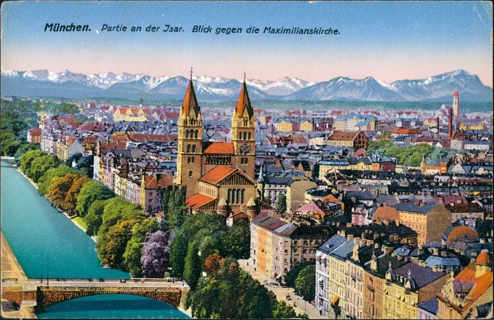 München Panorama Isarpartie Maximilianskirche Brücke Isar Gebirge 1930