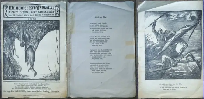 Münchner (Münchener) Kriegsblätter. - Dehmel, Richard / Goldschmitt, Bruno (Illustrationen.): Münchner Kriegsblätter. Richard Dehmel, Vier Kriegslieder mit Ur-Steindrucken von Bruno Goldschmitt. Krieg. Drittes (3.) Kriegsflugblatt der Zeitschrift 'Der Zwi