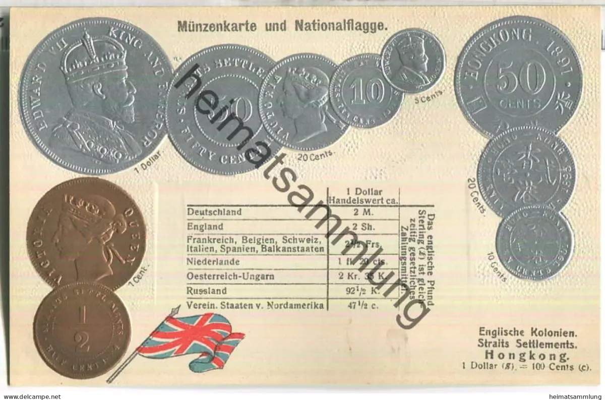 Münzkarte - Nationalflagge - Hongkong - Prägedruck - Verlag H. S. M.