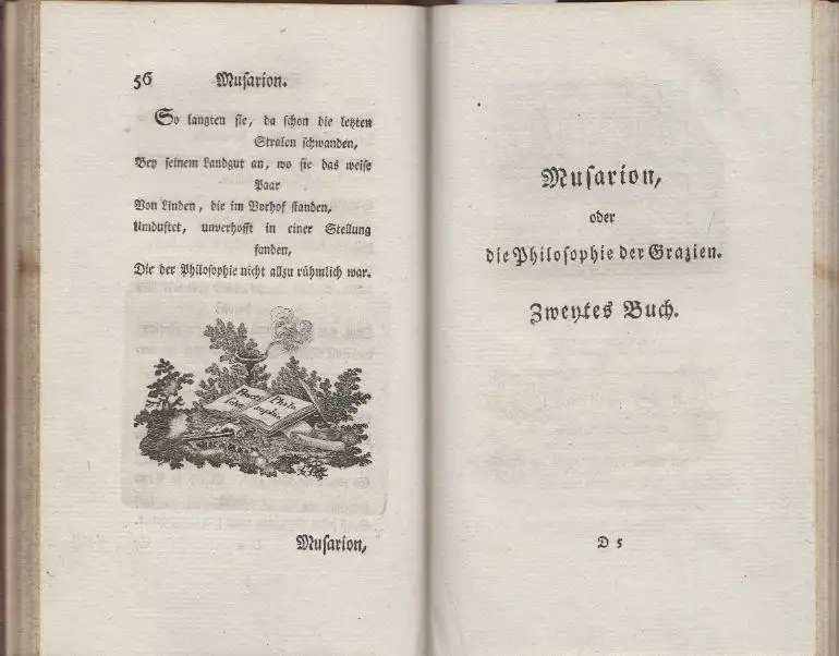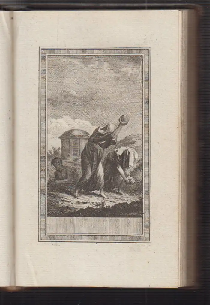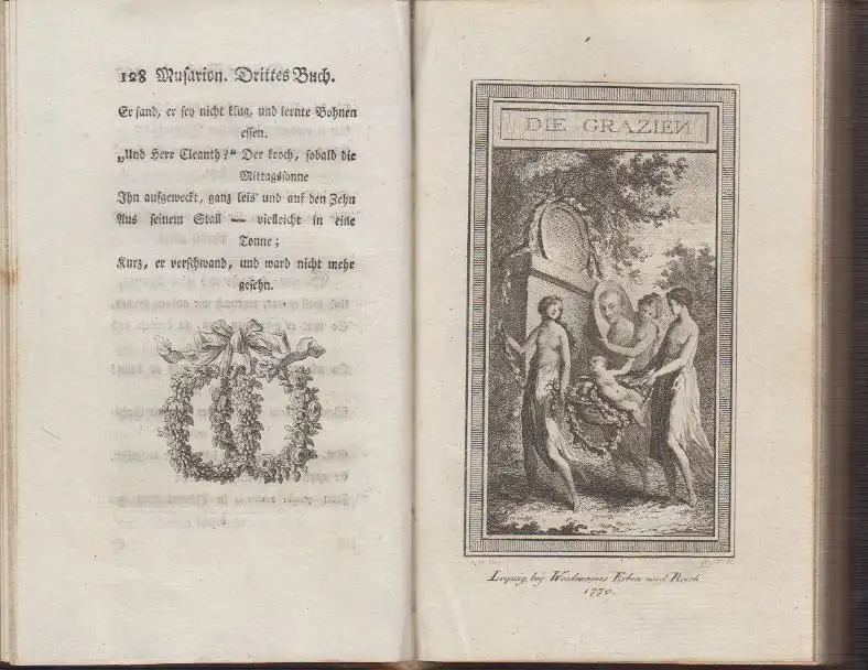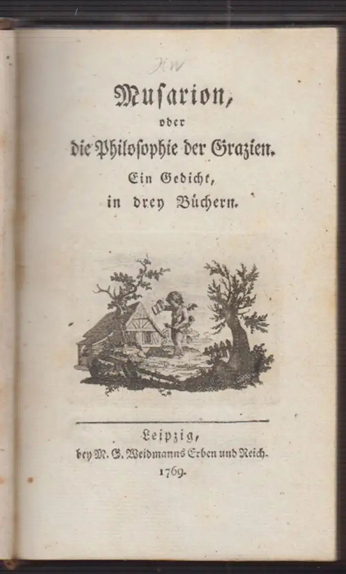 Bemerkungen: VD18 14780976; Holzm.-Boh III, 5550; vgl. Brunet V, 1444; vgl. Graesse VI, 448; Rümann 1256 - Ein Jahr nach der ersten illustr. Ausgabe. Mit den Kennzeichen des 2. Druckes dieser Ausgabe: dem verbessertem Druckfehler "niedrigen" statt "niedridgen" auf Seite 99; Seite XIX beginnt mit "freundschaftlichen" statt "schaftlichen". Die Kupfer ohne Künstlersignaturen. - Beigeb.: Ders. Die Grazien. Ebda. 1770. 206 S. Mit gest. Tit. 8 Textkupfern u. 6 Kupfertaf. von Geyser nach A. F. Oeser. EA. EA (W.-G² 51) Hier bereits mit dem korrigierten Druckfehler auf Seite 17: "Kopf", statt "Kop", (Günther/Zeilinger 417; Holzm.-Boh. II/7931; Borst 218; vgl. Goed. IV/1, 55,63; Rümann 1254; VD18 14372495-007)