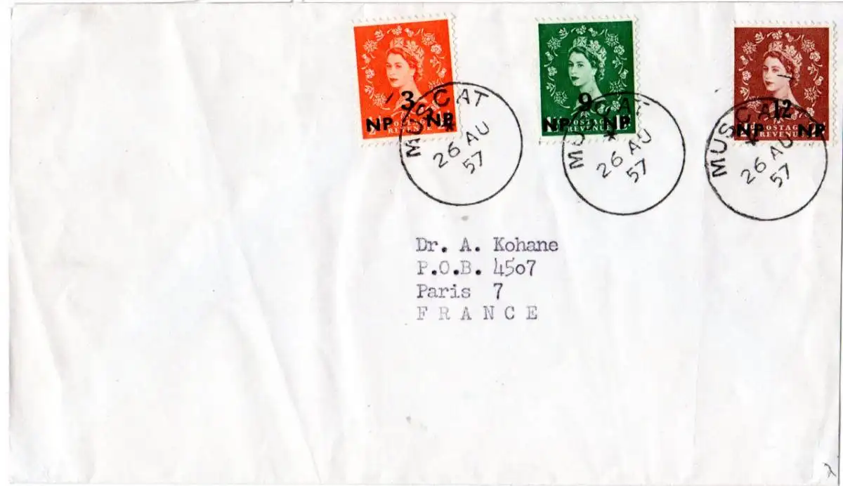 Muscat 1957, 3 GB Elizabeth Überdruck-Marken auf Brief n. Frankreich