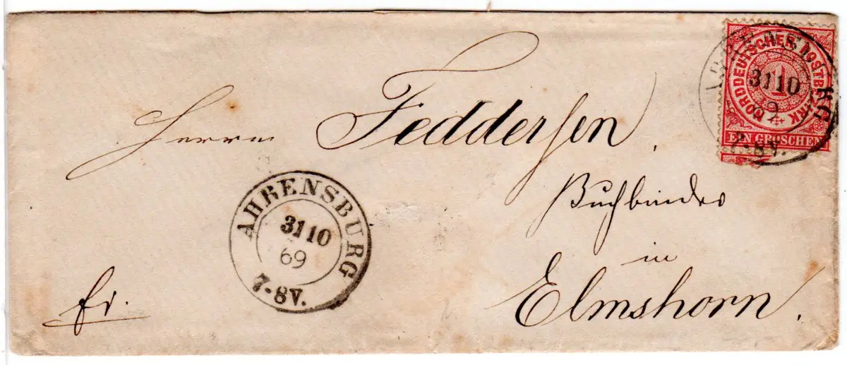 NDP 1869, Brief m. 1 Gr. u. nachverw. Schleswig-Holst. K2 Ahrensburg n. Elmshorn