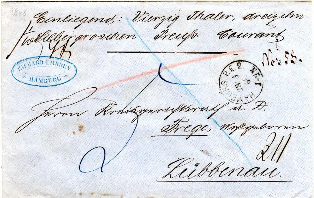 NDP 1869, K1 Hamburg P.E.2 auf Wertbriefumschlag n. Lübbenau. Porto 5 Gr.