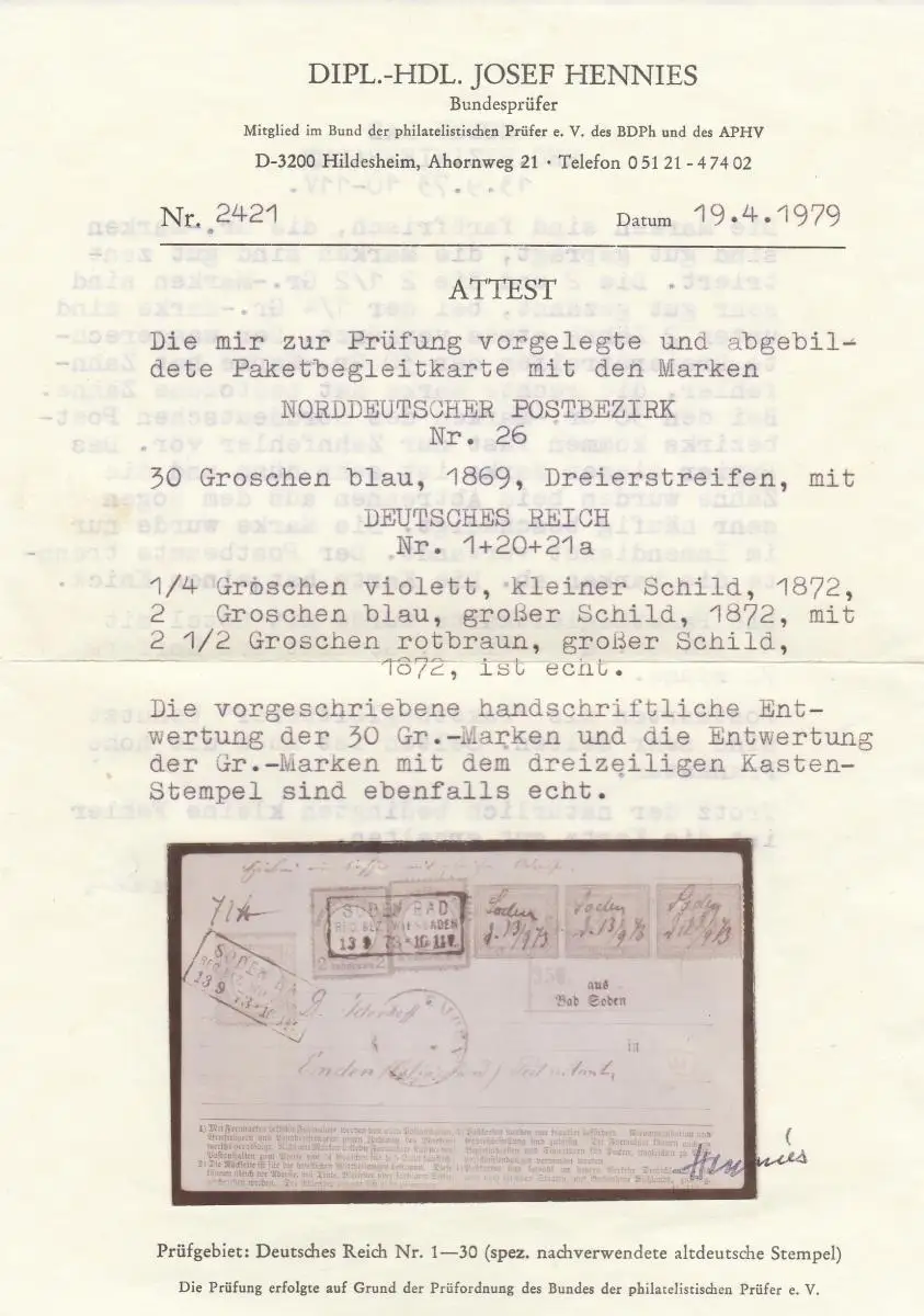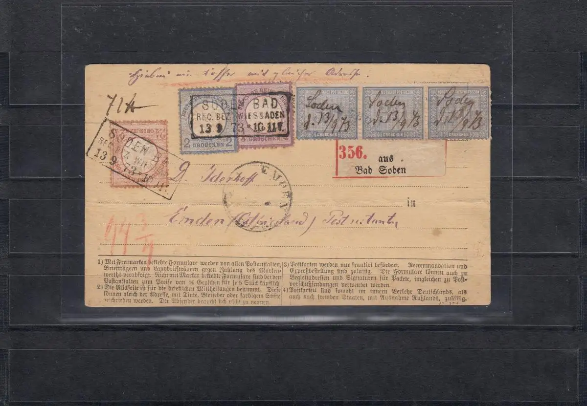 NDP MiNr. 26, DR MiNr. 1,20,21a auf Paketbegleitkarte 1873 Bad Soden nach Emden