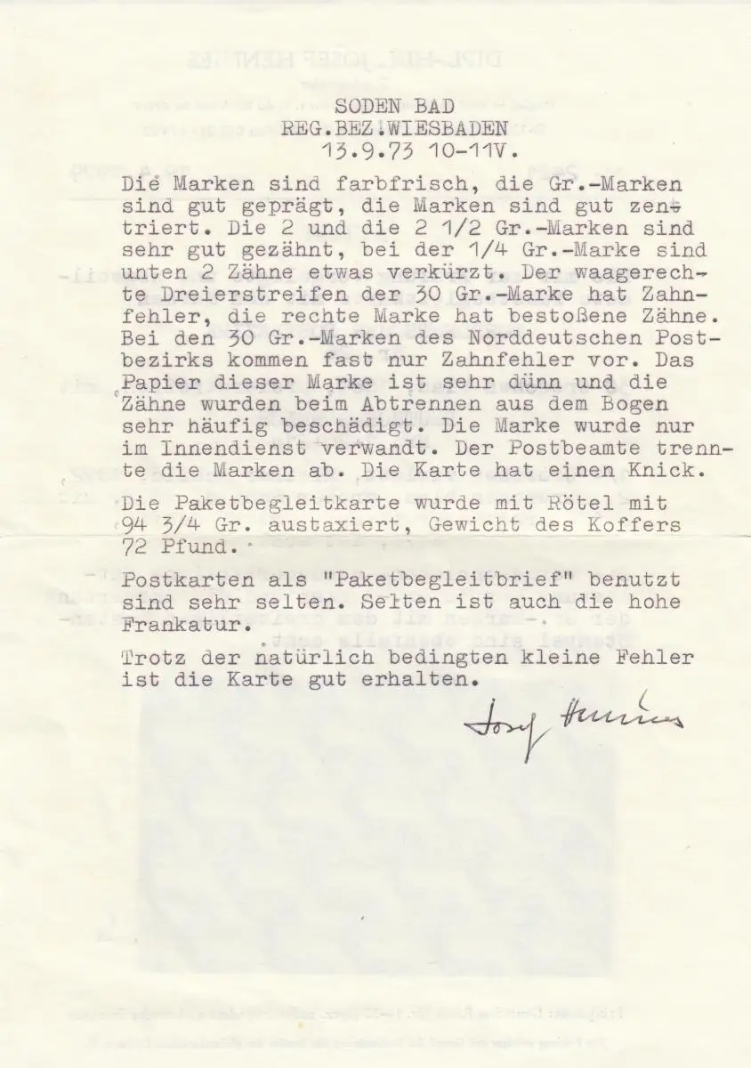 Vorschriftsmäßige Entwertung mit handschriftlicher Entwertung. 3er Streifen mit üblichen Zahnunebenheiten, 1/4 Gr. Marke unten mit 2 verkürzten Zähnchen. Die Karte hat einen waagrechten Bug, insgesamt aber für einen Beleg dieser Art eine gute Erhaltung der 72 Pfund schwere Koffer wurde mit 94 3/4 Gr. austaxiert.