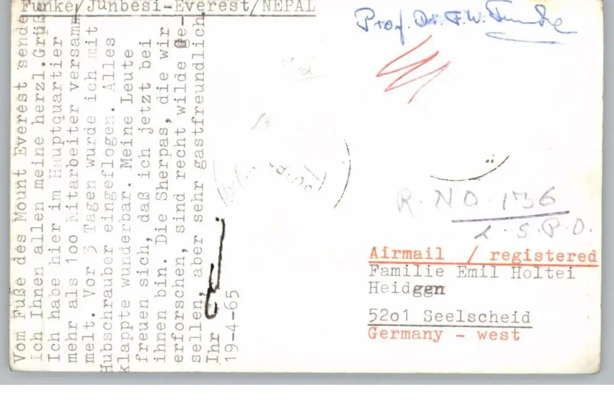 NEPAL - Funke Junbesi - Everest Expedition 1965, Photo-AK mit Text v. Prof. Funke