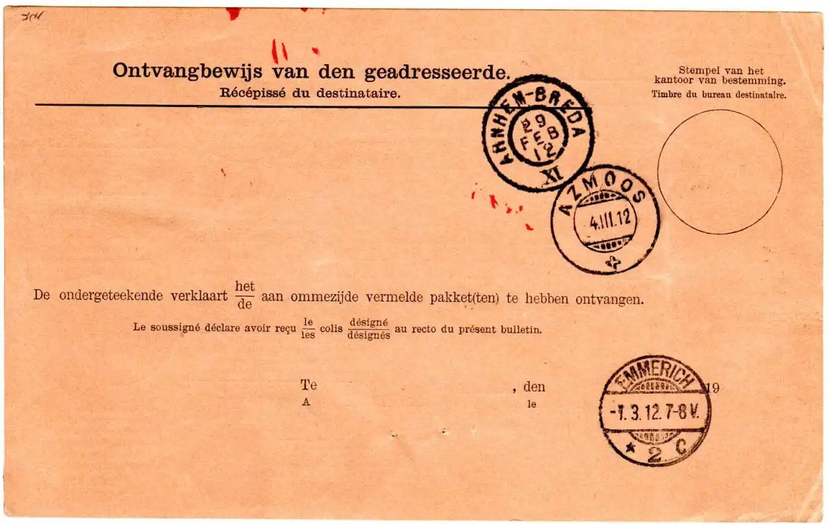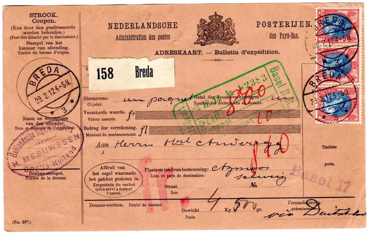 NL 1912, MeF 3x25 C. auf Zigarrenfabrik Paketkarte v. Breda i.d. Schweiz