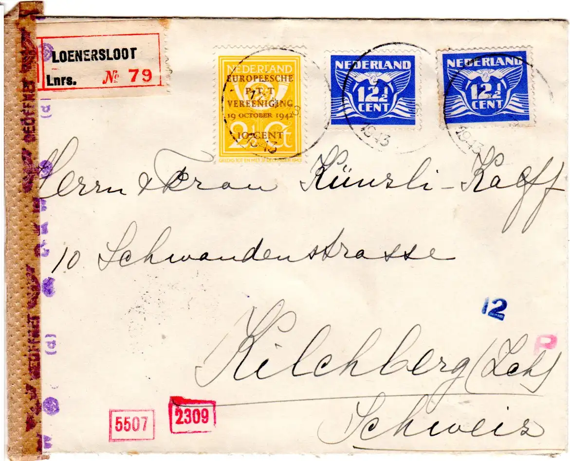 NL 1943, 10+2x12 1/2 C auf Einschreiben Zensur Brief v. Loenersloot i.d. Schweiz