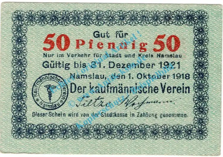 Namslau , Notgeld 50 Pfennig Schein in kfr. Tieste 4755.05.32 , Schlesien 1918 Verkehrsausgabe