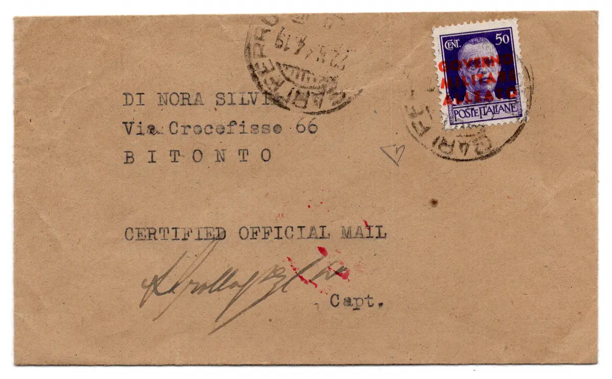 Napoli Occ. Alliierte - Cent. 50 Blocks auf kleinem Umschlag - Neapel Occ. Alliierte - Cent. 50 Nr. 12 isoliert auf kleinem Umschlag von Bari nach Bitonto am 22.5.44 - Ann. Interessante nicht philatelistische Postnutzung - ED Code 822/11