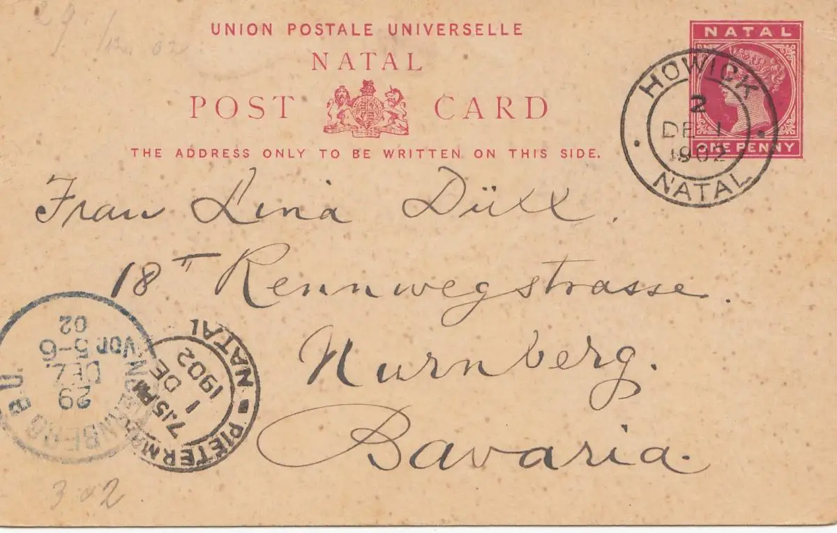 Natal: 1902: post card Howick to Nürnberg/Germany