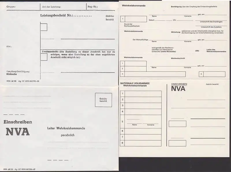 Nationale Volksarmee, 3 Formbl„tter, bzw. Umschlag, Wehrkreiskommando Gebhrenbefreiung