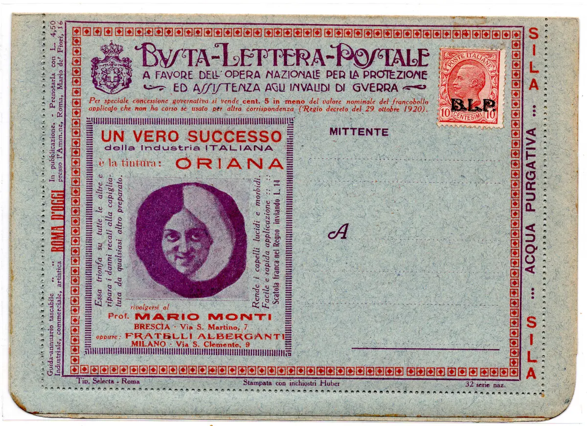 - Nationalmannschaft 32 Oriana - B.L.P. frankiert mit Cent. 10 II. Typ Nr. 5 nicht gereist, mit Innenfolie - Qualität: guter Zustand, Umschlag mit Abrieb auf der Rückseite Cod.214/182