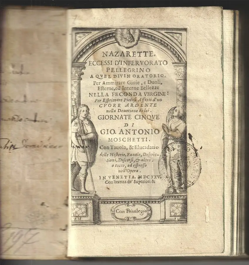 Venedig, [stamparia d` Euangelista Deuchino] 1625. 8°. Typographischer Titel mit gestochener figuraler Rahmung, 15 Bll., 330 S. (es fehlen die S. 267-270), 20 (von 27; es fehlt Z1 u. Aa 3-8) Bll. Mit 5 Kupferstich-Taf. Pgmt. d. Zeit mit verblasstem handschriftl. Rückentitel, Pergamentbezug über den Seitenschnitt rechtwinkelig ca. 0.5 cm überkantet, 2 Schließbänder fehlen. A. d. Gelenken wurmlöchrig, Titel mit verblasstem Rundstempel u. kl. Wurmspur, innen etwas gebräunt, Spiegel mit alten Besitzeinträgen, erste und letzte Ss. in der oberen Hälfte mit leichter Wasserspur. EA.