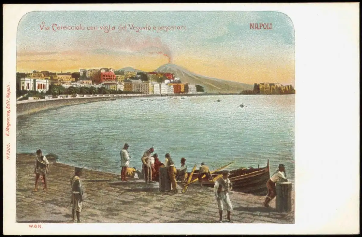 Neapel Napoli Via Caracciolo con vista del Vesuvio e pescatori. 1906