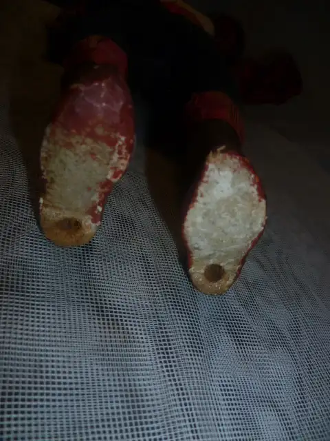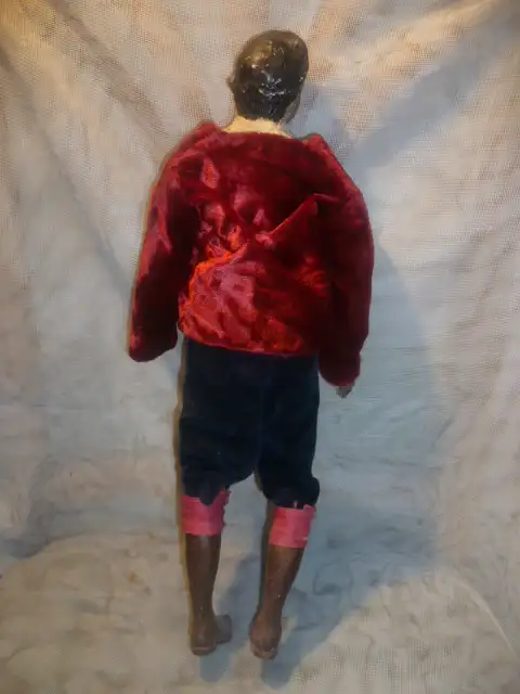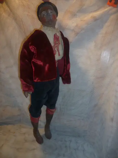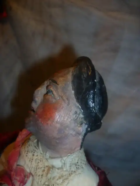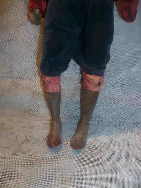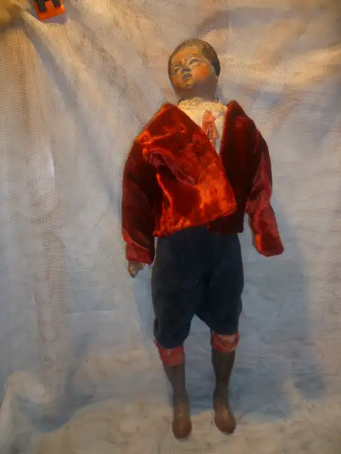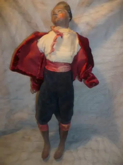 originale Bemalung, fein modellierter Tonkopf, Arme und Hände, fein gefasst, Körper mit Textilwerk