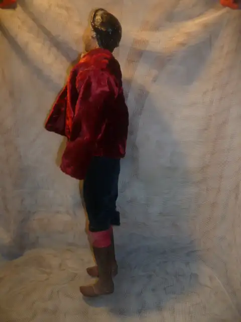 umwickelt, Seidengewänder, H: ca. 41 cm. Wohl zum Teil altrestauriert, das Textil zum Teil mit Altersspuren. Rechter Arm fehlend. Stiefel aus Holz geschnitzt am Stand sind Bohrungen zum Aufstellen