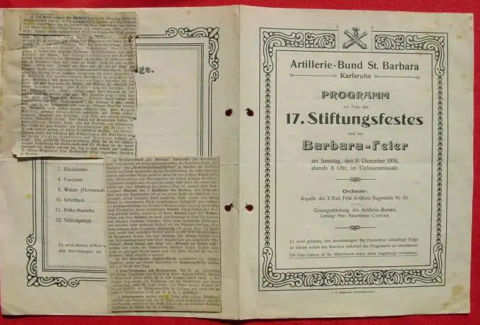Neu + gültig : Versandkosten ab Euro 2,50 (intern 0080430) Artillerie-Bund Karlsruhe 1909 : Vierseitiges Programm mit montierten Zeitungsausschnitten zur Feier des 17. Stiftungsfestes Artillerie-Bund St. Barbara Karlsruhe und Barbara-Feier 11.12.1909...