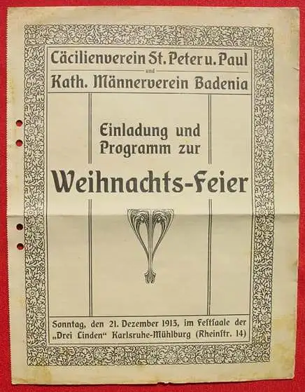 Neu + gültig : Versandkosten ab Euro 2,50 (intern 0080431) Karlsruhe / Baden. 4-seitige Einladung u. Programm zur Weihnachtsfeier des Caecilienvereins St. Peter u. Paul u. Kath. Männervereins Badenia vom 21.12.1913. Format ca. 23 x 29 cm. Gebrauchsspuren, gefaltet. Ich glaube dieser Heimatbeleg könnte für jeden Heimatsammler von Interesse sein ? PLZ-Bereich für Heimatsammler 76131