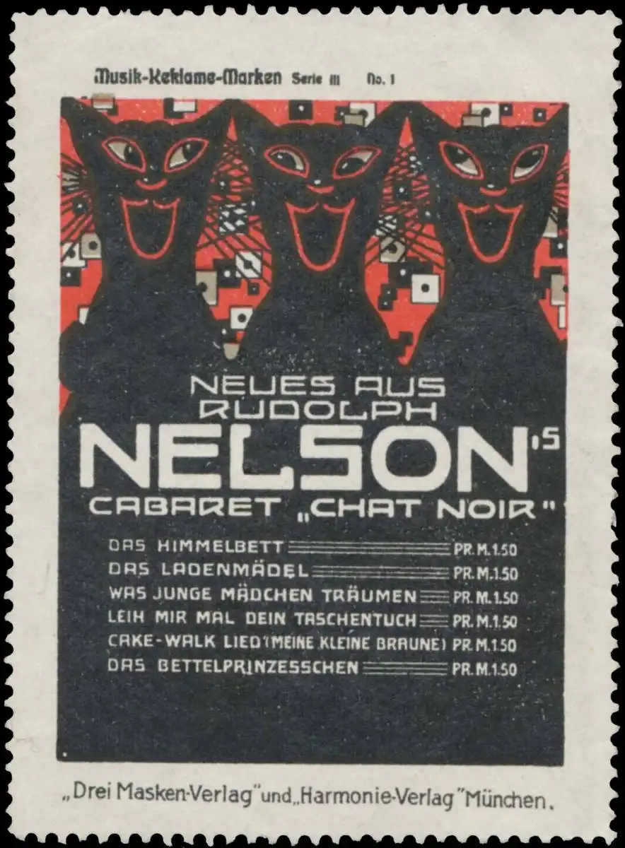 Rudolph Nelson, Musik-Reklame-Marke Serie III, 1, Katze, Drei Masken-Verlag und Harmonie-Verlag, Größe/Zustand: 7x5 , guter Zustand, Original alte Reklamemarke die seinerzeit für die Werbung benutzt wurde
