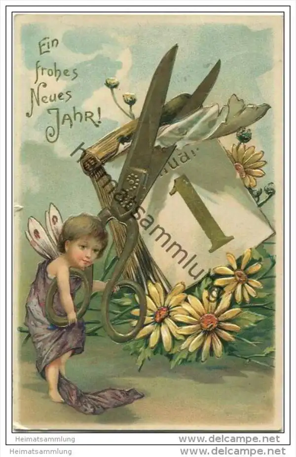 Neujahr - Elfe - Schere - Kalender - Prägedruck (E10853) gel. 1905