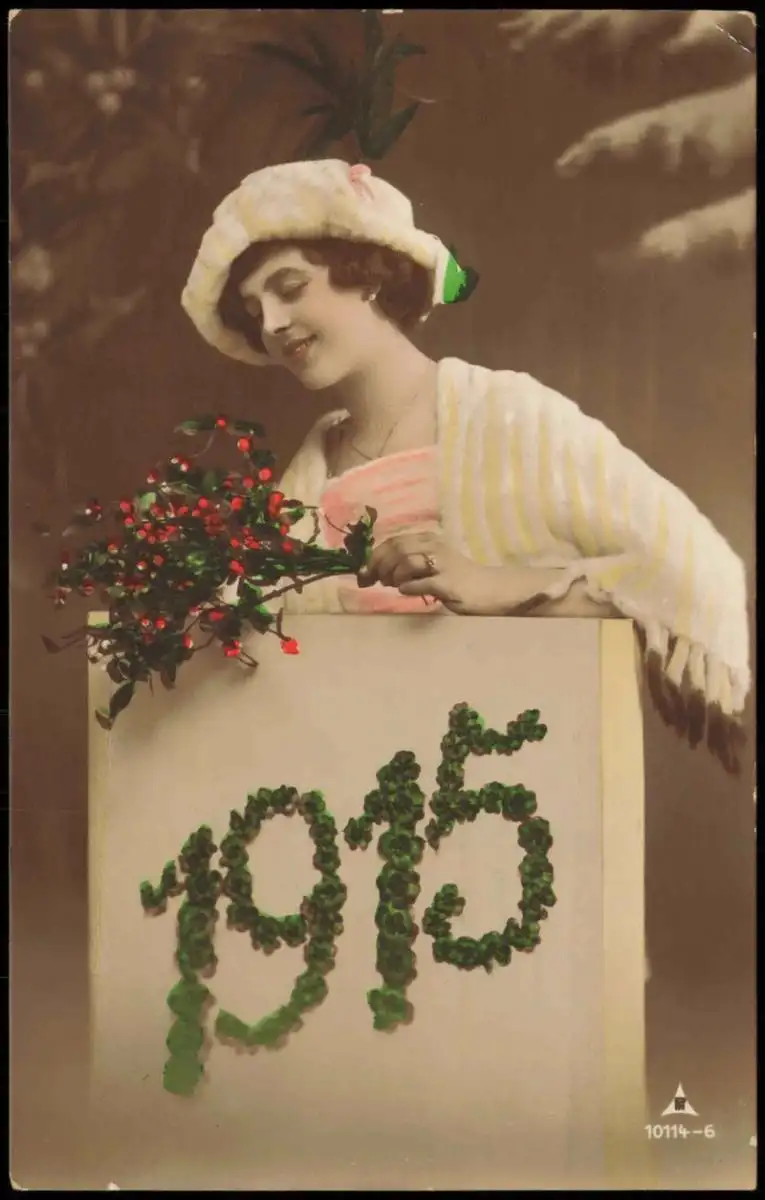 Neujahr Sylvester New Year Frau mit Mistelzweig Zahl aus Kleeblättern 1915