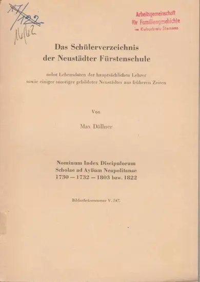 Neustadt an der Aisch. - Döllner, Max: Das Schülerverzeichnis der Neustädter Fürstenschule nebst Lebensdaten der hauptsächlichen Lehrer sowie einiger sonstiger gebildeter Neustädter aus früheren Zeiten - Nominum Index Discipulorum Scholae ad Ayßum Neapoli