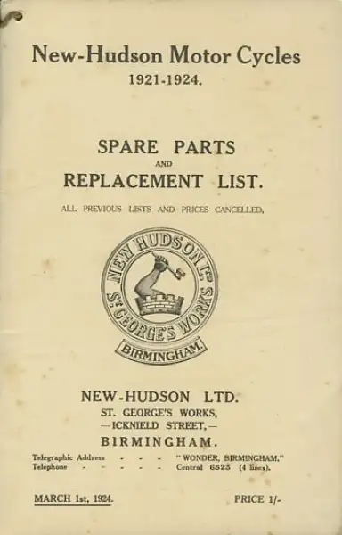 New Hudson Motor Cycles Teileliste / Spare Parts 1921-1924