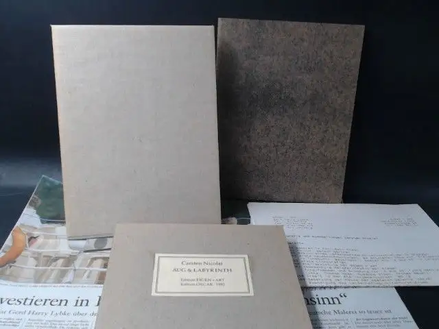 Aug & Labyrinth. 2 Hefte im Schuber. 1) Aug; 2) Labyrinth. Texte: Carsten Nicolai. Reprofotografie: Uwe Walter. Gestaltung: Petra Lurette Oberberg, Carsten Nicolai. Guter Gesamtzustand. Mit einem Zeitungsausschnitt und einer Kurz-Bio als Beilage