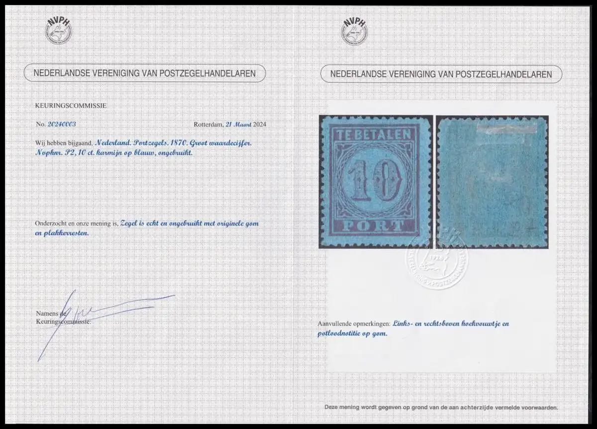Niederlande Portomarken 2 B mit Falz Fotoattest Vleeming #OF805